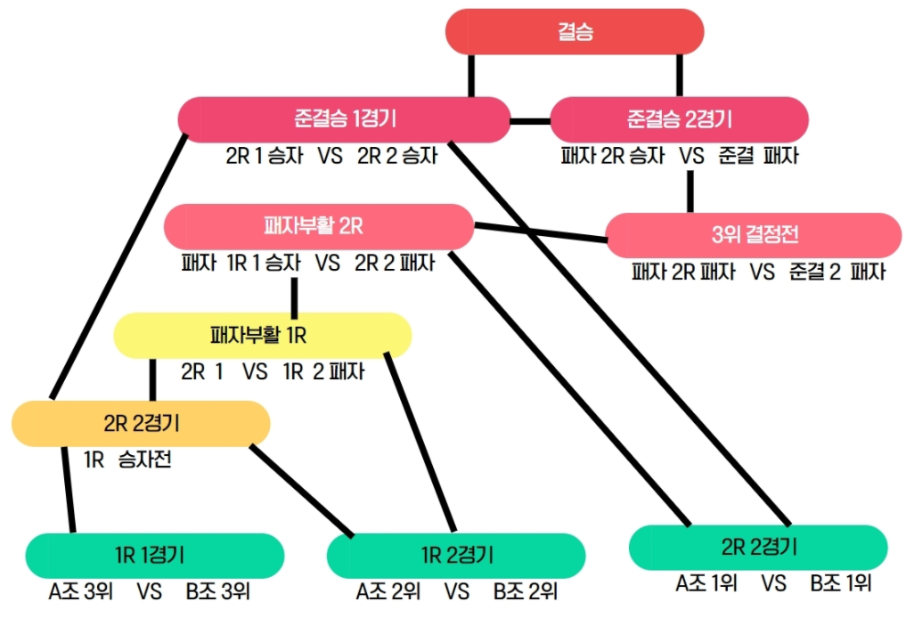 이번 올림픽에서의 야구는 녹아웃스테이지로 오프닝 라운드가 끝나면 모든팀에게 다시 기회가 주어지는 토너먼트라고 생각하시면 됩니다. 이 녹아웃 스테이지는 야구에서 종종 쓰이기도 하는데 이 토너먼트의 특징이 조별리그의 순위에 따라 얻는 이익이 다르기에 표를 꼭 보시고 확인하시면 됩니다.