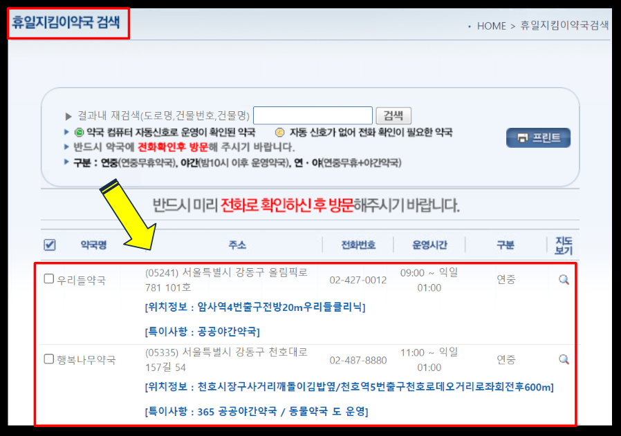 그러면 이렇게 일요일약국과 더불어 휴일지킴이약국도 나오는데요, 반드시 전화로 확인하시고 방문해주세요.