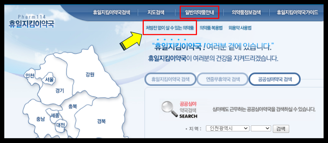 이번에는 처방전없이 살 수 있는 의약품에 대해 알려드리려고 하는데요, 위에 일반의약품 안내에서 처방전 없이 살 수 있는 의약품을 눌러주세요.