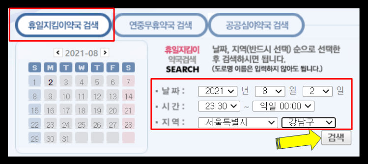일요일 약국 여는곳을 찾으시려면 휴일지킴이약국 검색에서 날짜와 시간 그리고 지역을 눌러주시고 검색을 눌러주세요.