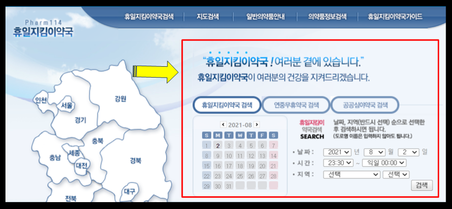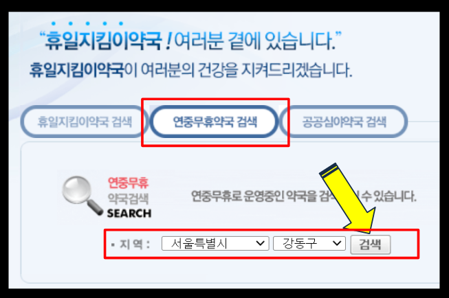 자, 이번에는 일요일 약국과 더불어 연중무휴약국을 알아볼텐데요, 지역을 선택해주시고 검색을 눌러주세요.