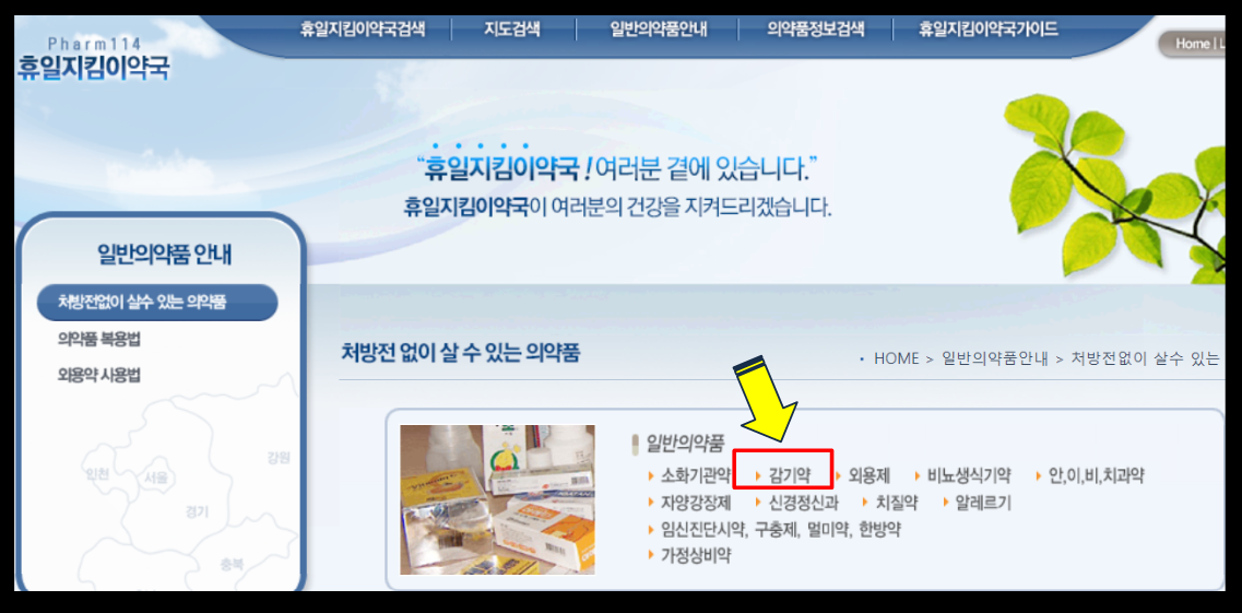 이번에는 처방전없이 살 수 있는 의약품에 대해 알려드리려고 하는데요, 위에 일반의약품 안내에서 처방전 없이 살 수 있는 의약품을 눌러주세요.