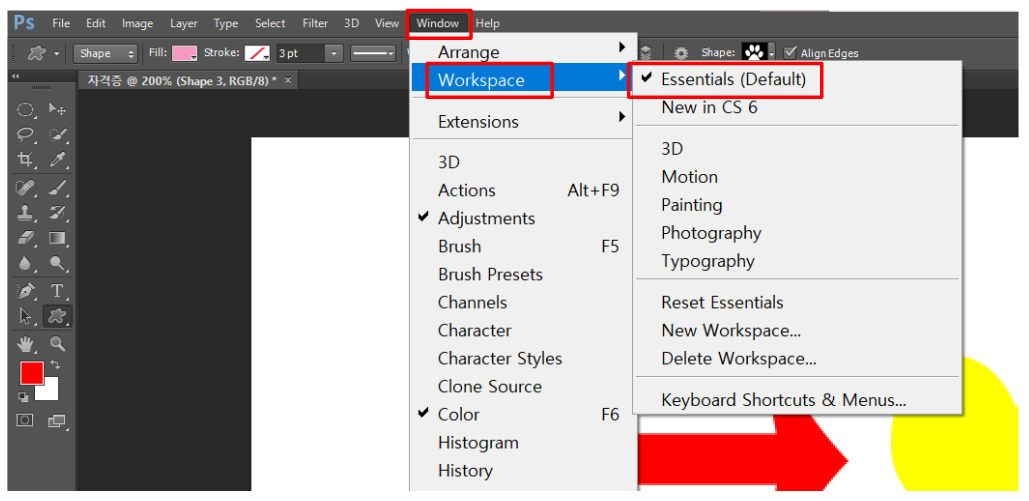 Window 창 -> Workspace -> Essentials(Default) 체크가 되어있는지 확인하시면 됩니다.