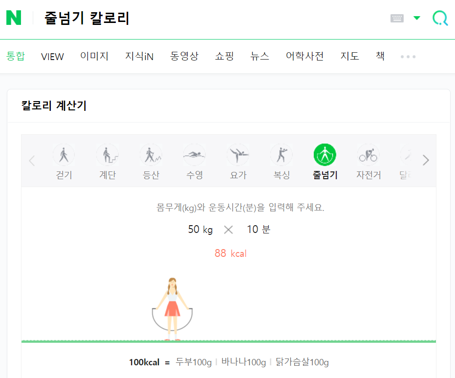 줄넘기 칼로리에 대해 알아보려고 네이버에서 줄넘기 칼로리를 검색해보니, 이런 화면이 나오는데요. 몸무게에 따라 운동 강도가 달라지는 것을 볼 수 있습니다. 그래서 저는 예를 들어 제가 50kg을 가정하였을 때 10분 운동을 한다면? 검색해보니 88kcal 나오는데요, 체중이 증가할수록 빠지는 칼로리 소모는 점점 증가합니다.