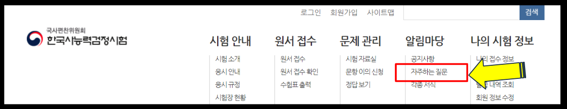 저희는 한국사능력검정시험에 들어온 이유는 한국사 자격증 유효기간이 존재한 지 알아보기 위해서인데요, 여기서 보시면 위에 알림 마당을 눌러주시고, 자주 하는 질문을 눌러주세요.