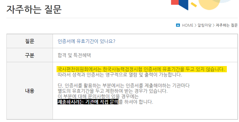 그렇다면, 이렇게 뜨는데요. 국가편찬위원회에서는 한국사능력검정시험 인증서에 유효기간을 두고있지 않다고 뜨는데요, 제출하는 기관별로 유효기관이 다르다고하니 아래의 내용을 참고해주세요. 각기관별로 유효기간이 다르기에 직접 전화로 알아보셔야 하는데 제가 한번 정리해봤습니다.