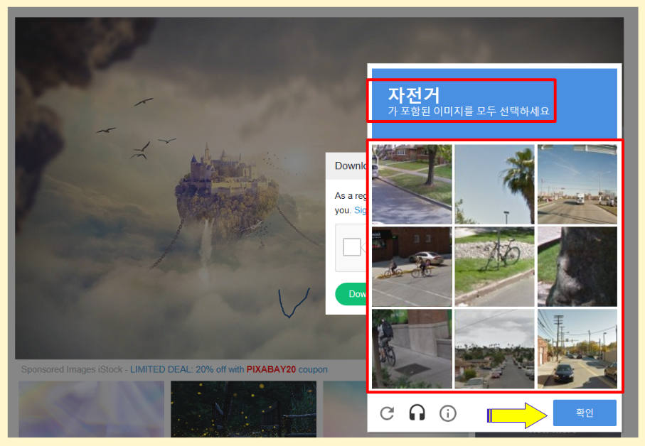 빨간색 블러 처리를 보시면 자전거가 포함된 이미지를 모두 선택하세요라고 적혀져 있는데, 아래 9칸의 사진 중에 자전거가 있는 곳을 클릭 후에 확인을 눌러주세요.