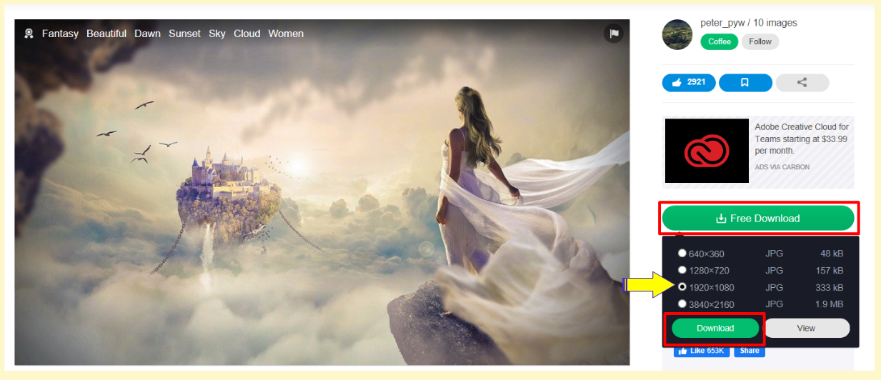 다운로드를 누르시면 아래에 해상도를 선택할 수 있는 창이 뜨는데, 저는 포토샵을 위해 다운로드하기에 3번째 1920 * 1080을 클릭하고 다운로드를 눌렀습니다. 여러분들은 사용하실 사진이 어ᄄᅠᆫ 해상도가 필요한지 확인하시고 클릭하시면 됩니다.