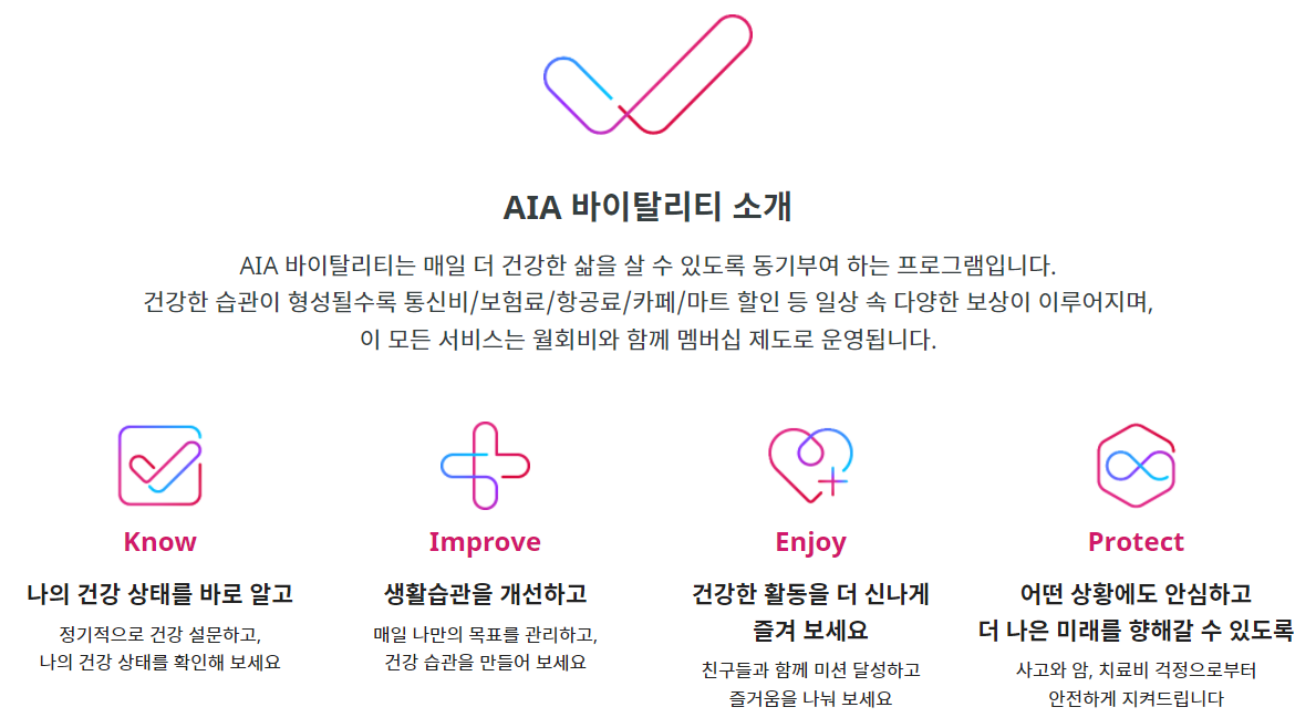 AIA 바이탈리티는 과학을 기반으로 하는 건강관리 프로그램이라서 고객들의 암 발병 위험을 낮춰주는 것을 도와주는 것입니다. 그래서 AIA생명보험은 바이탈리티 통합형 상품 포트폴리오 강화의 일환으로 혁신적인 암보험 상품도 출시했다고 합니다. 새로 출시된 AIA 바이탈리티 암보험은 바이탈리티 앱을 다운로드하으셨으면 잘 아실 텐데요, 바이탈리티 등급에 따라 고객이 건강해질수록 보험료가 할인되는 시스템입니다. 그래서 현재 가입 즉시 보험료 10% 선할인 서비스를 제공하고 있고 추가적으로 헬스 앤 웰니스 활동을 한다면 매주 리워드를 제공하고 있습니다. 즉, 고객들은 질병의 발생을 원인을 줄여 건강한 삶을 살 수 있을 거라는 취지라고 예측됩니다.