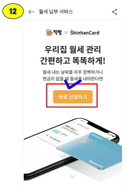 저희는 월세를 신한카드로 납부할 예정으로, 바로신청하기를 눌러줍니다.