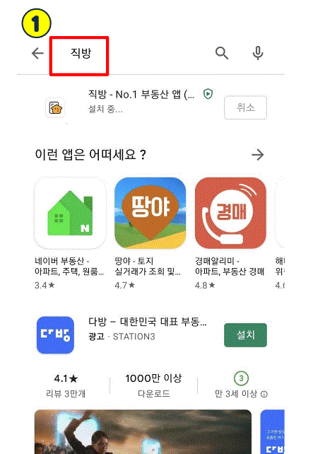 1. 어플리케이션 앱에 ' 직방 ' 을 입력하고 다운로드합니다.