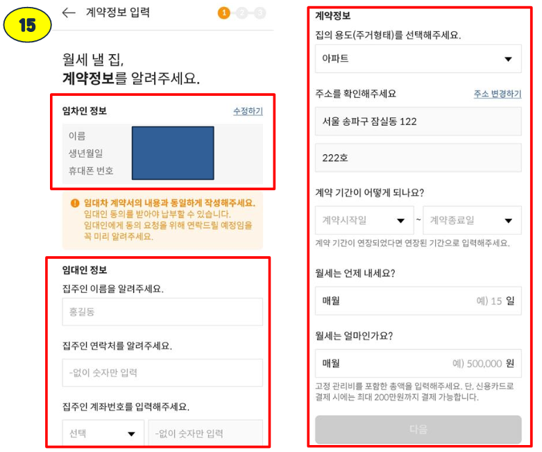마지막으로 주소와, 계약기간, 그리고 월세날짜 월세금액까지 차근차근 작성해 주시고 다음을 눌러주세요.