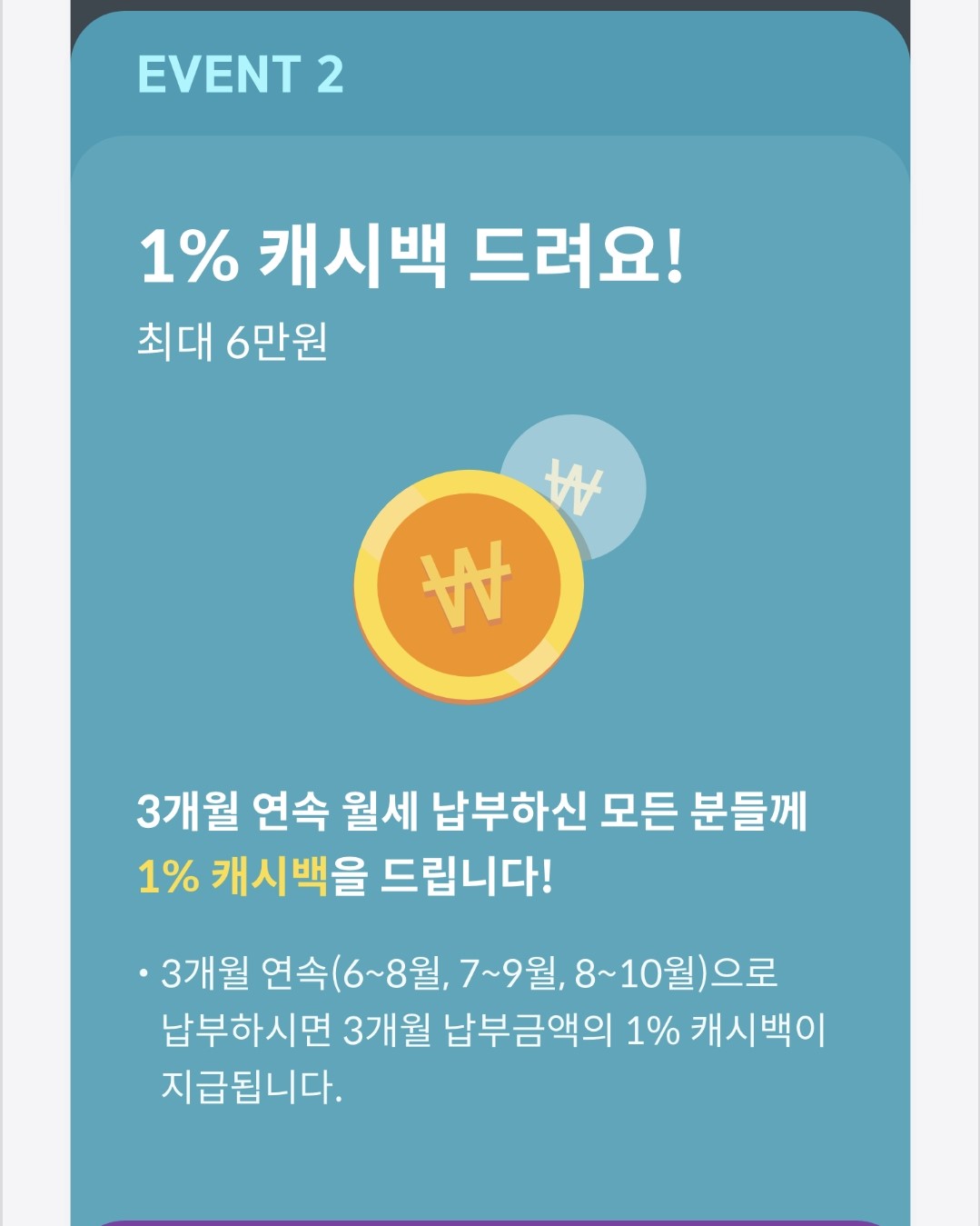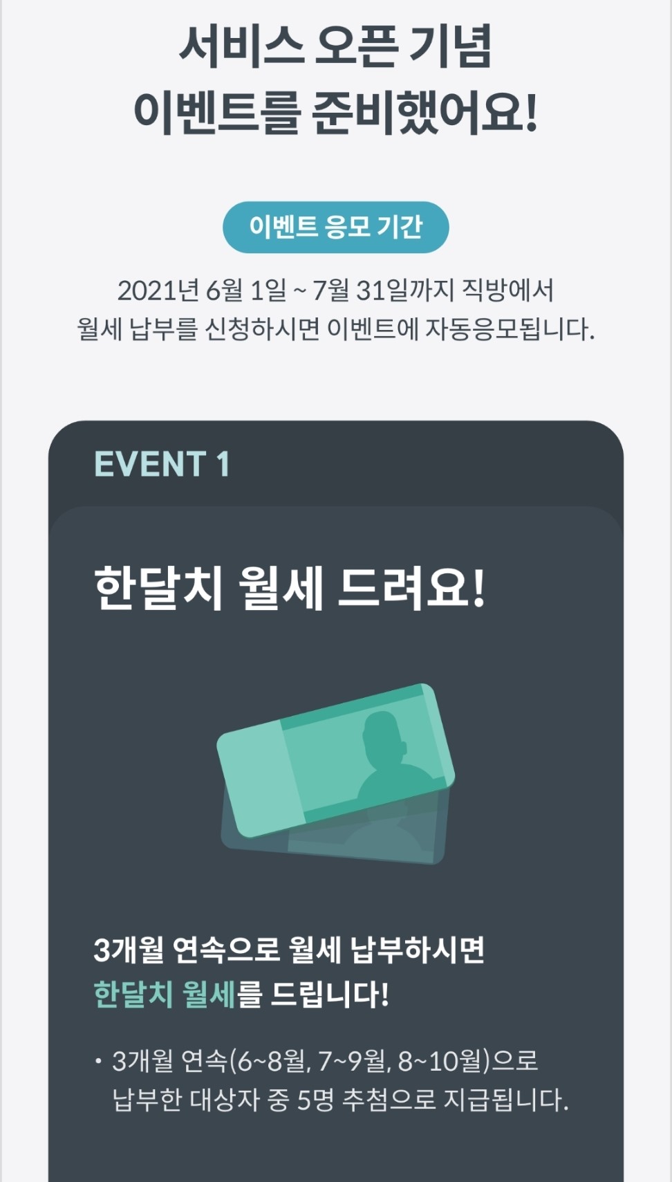 1. 7월 31일까지 직방 앱에서 월세 카드 납부 서비스를 신규 신청한 고객 전원에게 3개월 동안 이용 수수료(1%)를 캐시백