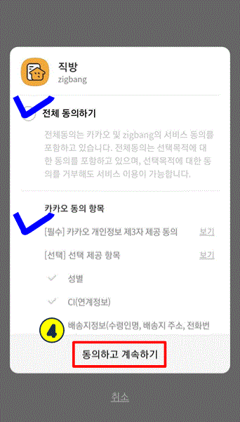 4. 전체 동의를 해주시고, 동의하고 계속하기를 눌러주세요. 잘 따라오고 계시죠? 금방입니다!
