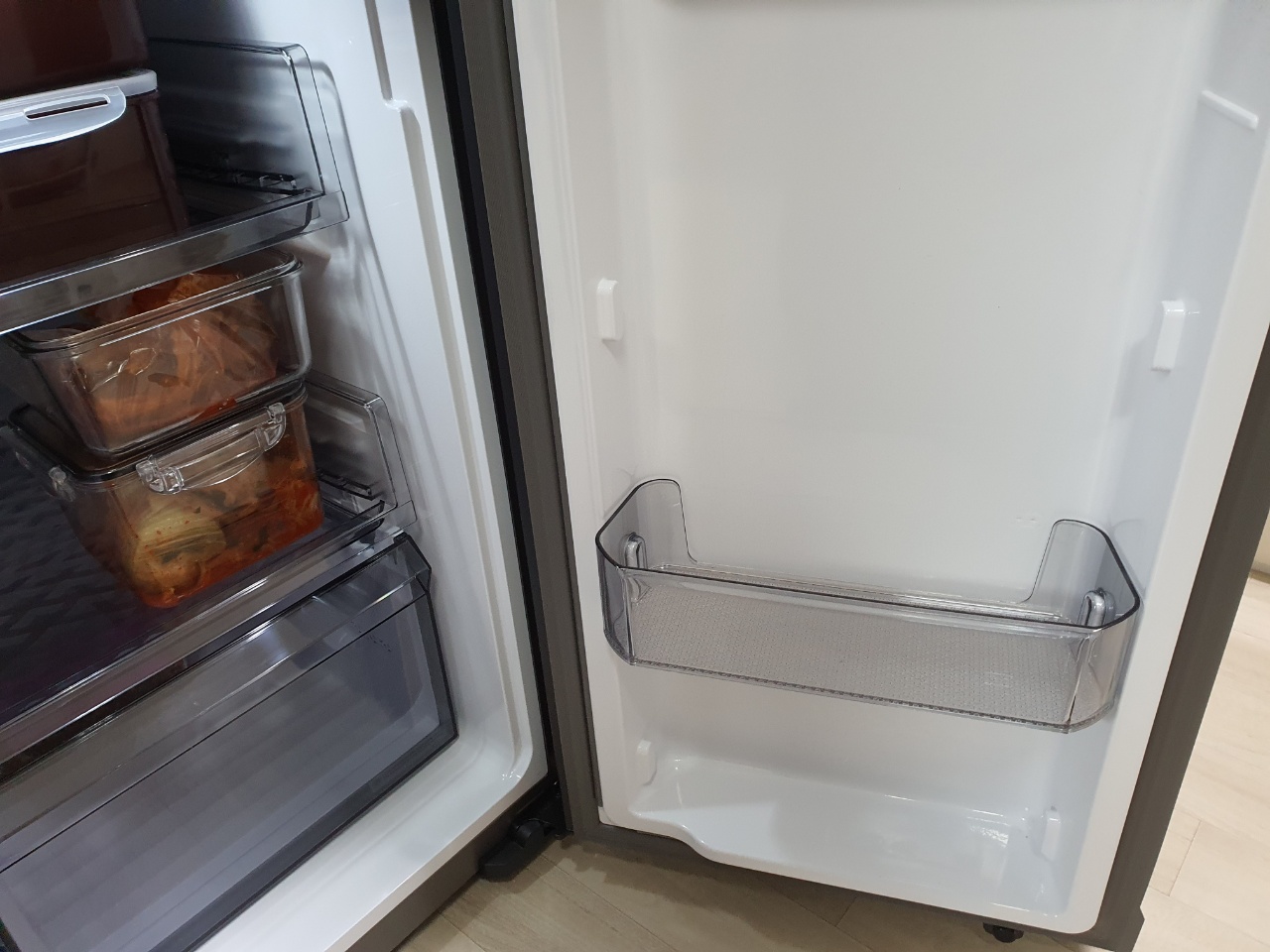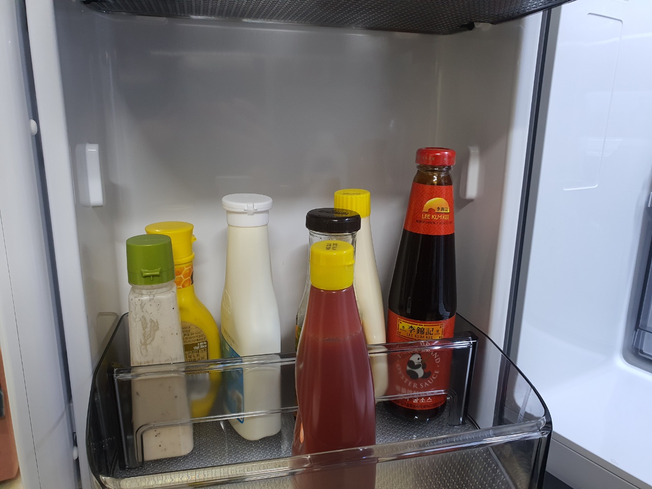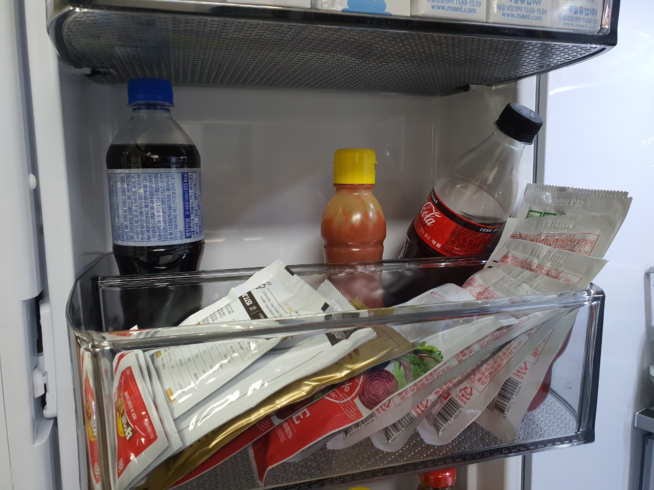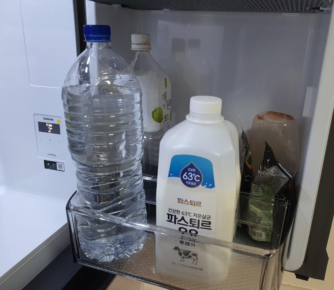 왼쪽 두 번째 칸은 500ml 콜라가 들어갈 수 있는 사이즈인데, 펩시콜라는 가능한데 코카콜라 사이즈는 되지 않기 때문에 참고하시면 좋을 것 같습니다. 그리고 왼쪽 제일 아래칸을 보면 엄청 높기 때문에 굴소스 큰 것을 내버려두어도 공간이 남습니다.