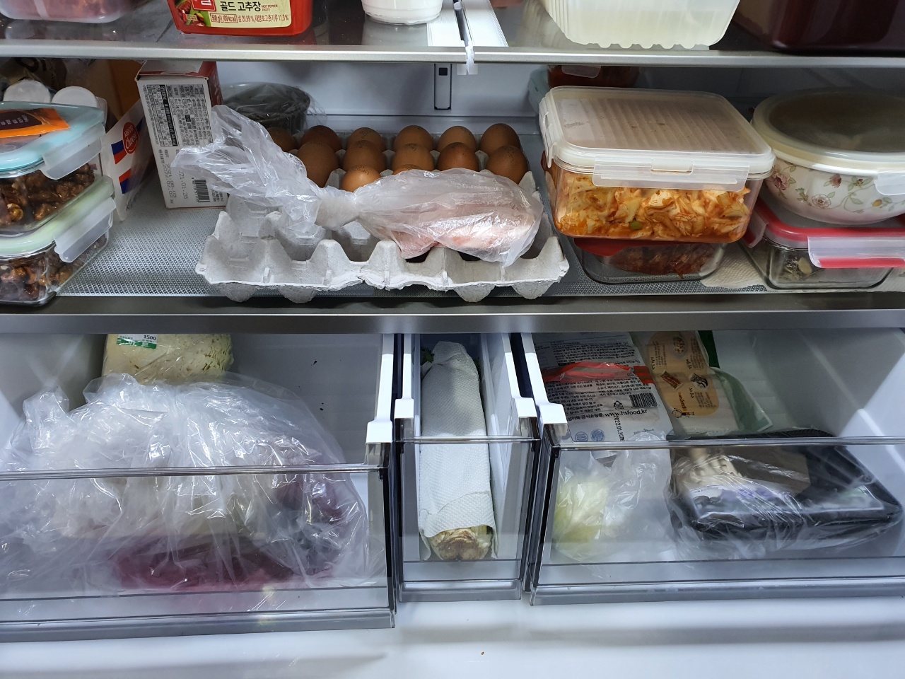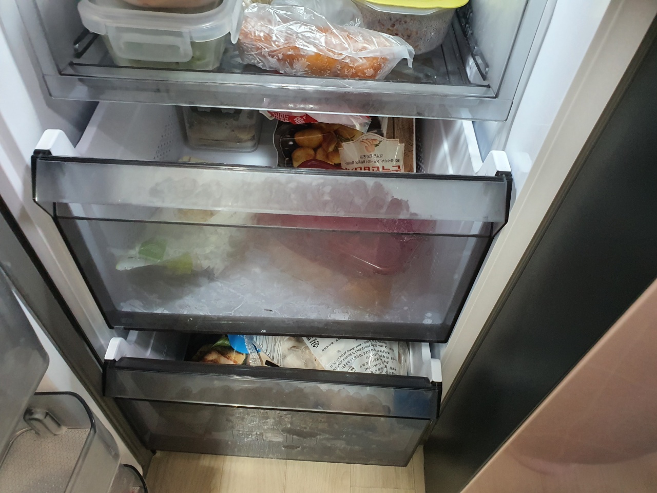 냉동고 칸에는 깊이 있는 칸이 2칸 정도 있고 위에는 아무렇게나 막 내버려둘 수 있어서 편합니다.