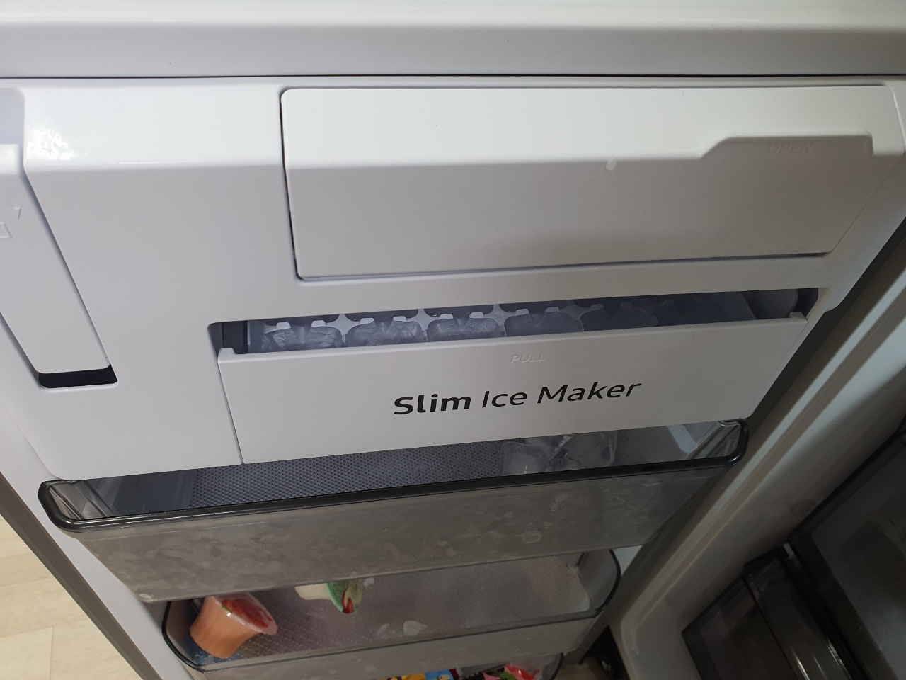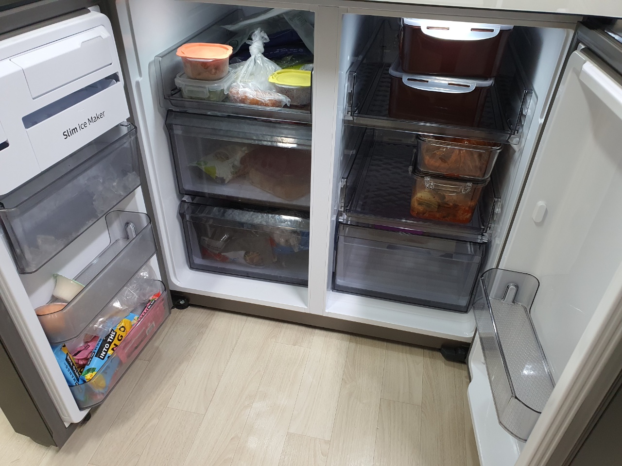 냉동고를 열어보겠습니다. 왼쪽과 오른쪽이 있는데요, 왼쪽은 냉동고로 사용하고 있고 오른쪽은 김치냉장고로 사용하고 있습니다. 특히 삼성전자 비스포크 냉장고 875L 4도어 RF85A9103AP 보시면 아이스메이커에 이물질에 대해서 많은분들이 조금 신경을 쓰이실텐데요, 저도 마찬가지로 구입하기전에 고민이 되었던 부분입니다.