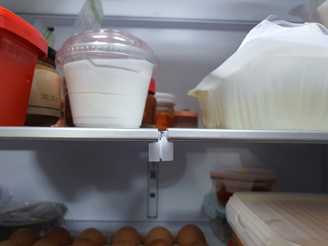 냉장고 가운데를 보게 되면 이렇게 나눠져 있는 칸이 있는데요, 만약에 높이가 있는 제품을 넣으시려면 빼서 넣으시면 됩니다. 그리고 튼튼하지 않아 보여서 조금 걱정했었는데, 생각보다 튼튼해서 문제없더라고요!