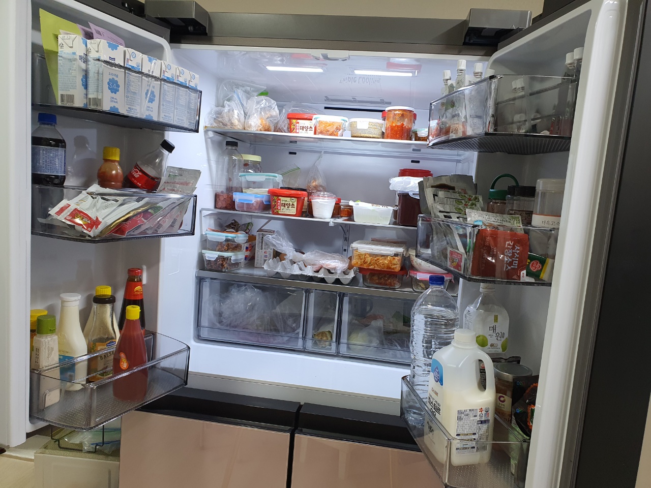 냉장고를 열어봤는데요 삼성전자 비스포크 냉장고 875L 사이즈만큼이나 엄청 많이 들어가네요, 4인 가족이라고 해도 충분히 사용 가능한 냉장고입니다.