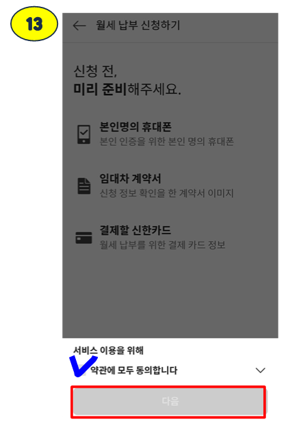 저희는 월세를 신한카드로 납부할 예정으로, 바로신청하기를 눌러줍니다.