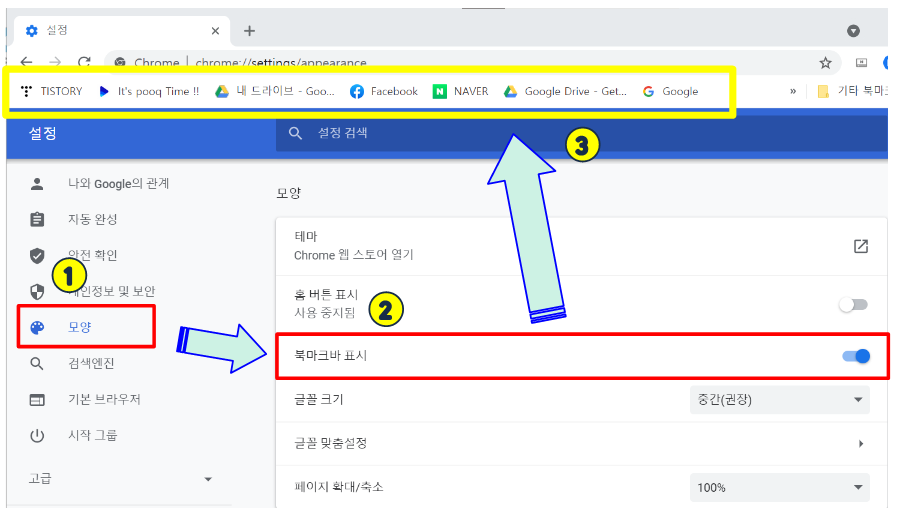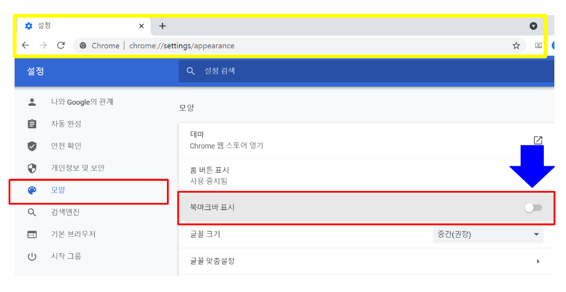 <모양>을 누르시고 화살표 방향으로 쭉 가시면 북마크바표시라고 되어있습니다. 바로 사용한다고 되어있기에 위에 북마크바(즐겨찾기바)가 활성화가 되어있습니다. 비활성화를 하고 싶으신 분들은 아래에 집중해주세요.