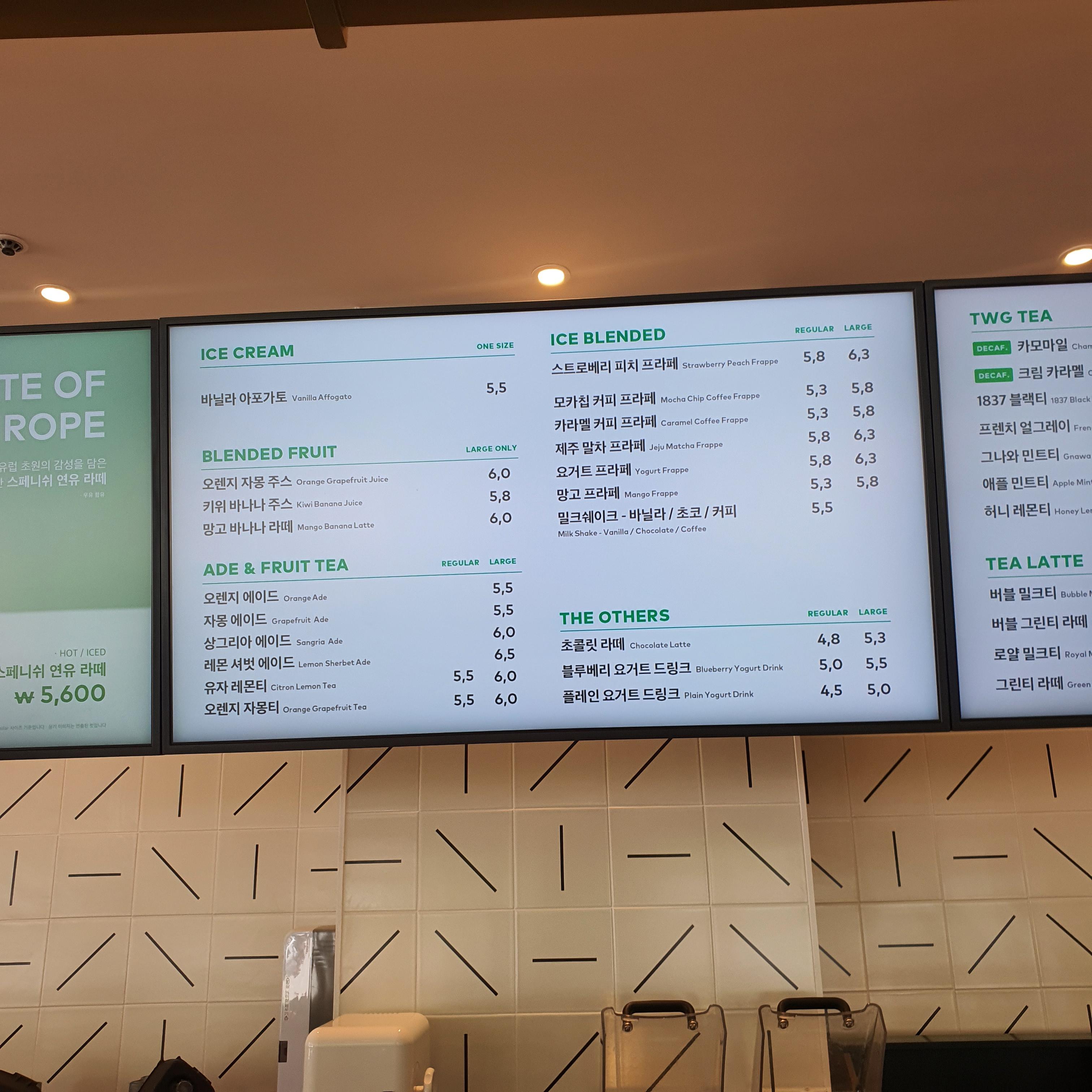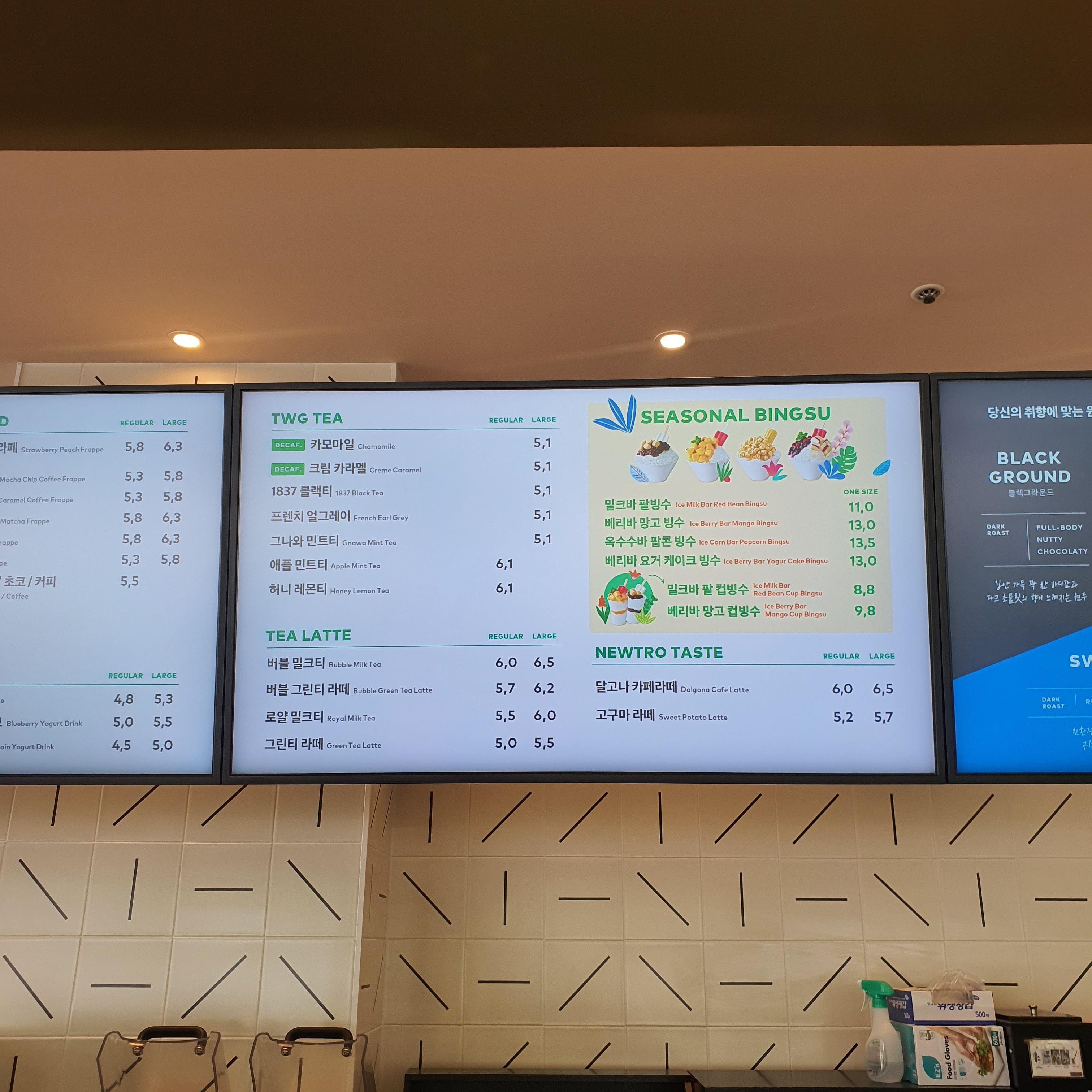메뉴판이 주문하는 곳 위에 이렇게 전광판처럼 되어있어서 또렷하게 잘 보여요! 그리고 막 사라지지 않아서 집중해서 메뉴를 고를 수 있습니다. 투썸 송도 국제도시점이 아무래도 생긴 지 얼마 안돼서 그런가 봐요^^