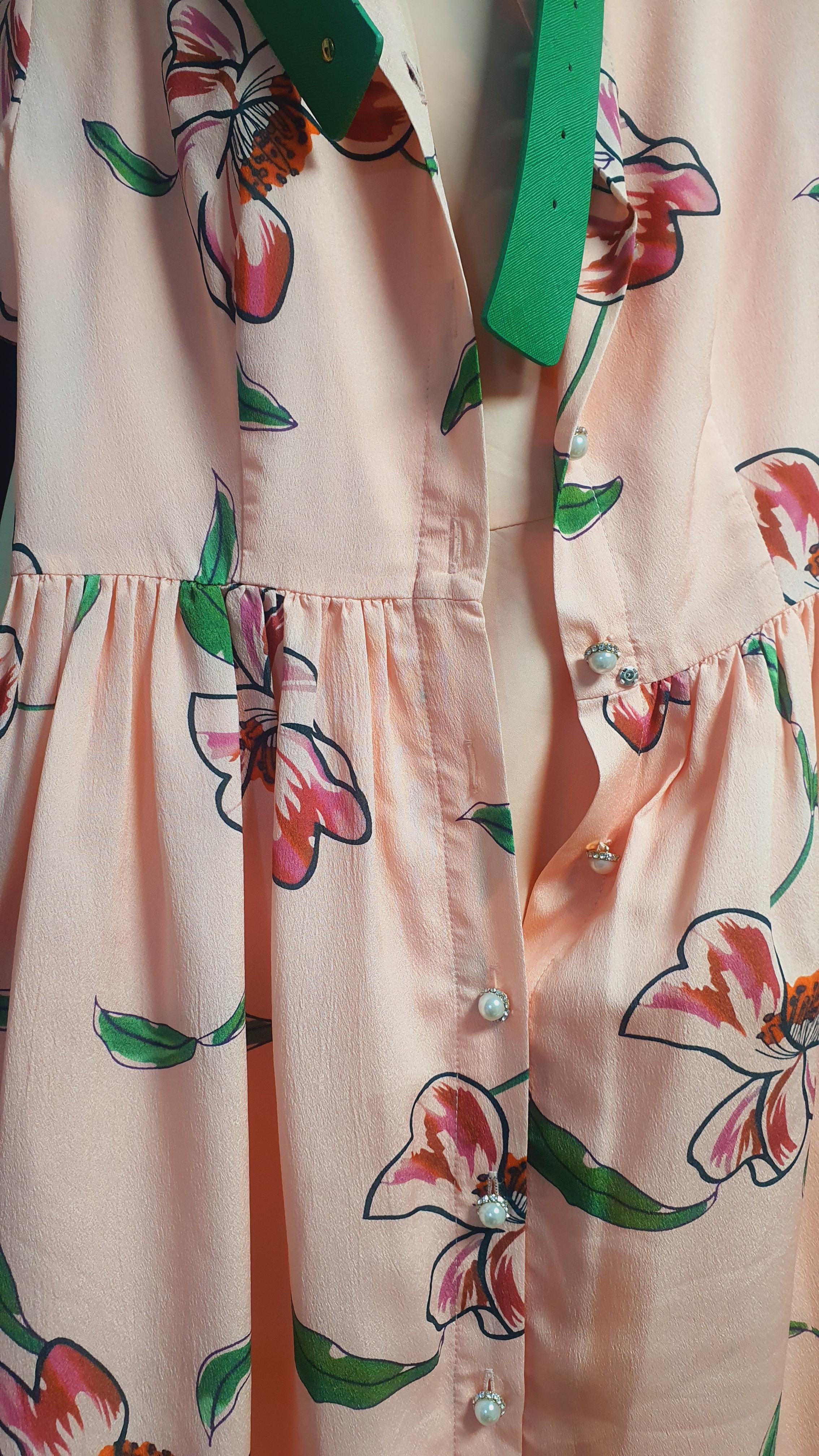 차르르 떨어지는 소재로 구김 없이 시원하게 입을 수 있는 샤틴원피스입니다. 은은한 딸기우유 같은 핑크색과 진한핑크로 물든 빅플라워 패턴으로 조화롭게 어울리는 반면에 허리에 그린계열 벨트로 포인트를 주었습니다. 유니크하지만 트렌디하게 입을수있는 옷이라서 하체가 조금 튼튼하시거나 피크닉 갈 때 편하게 입지만 튀어보고 싶을 때 입으면 좋은 옷입니다.