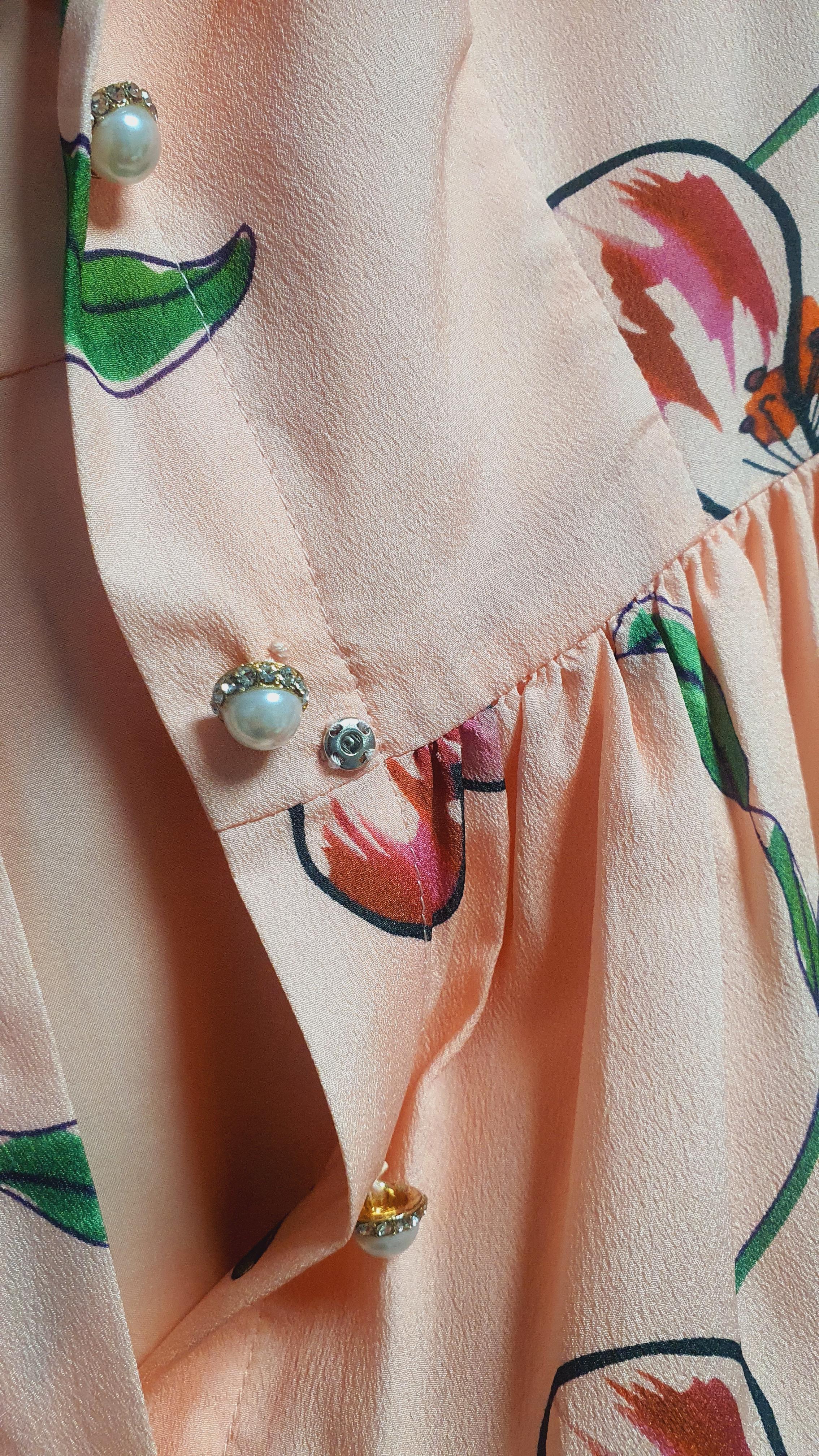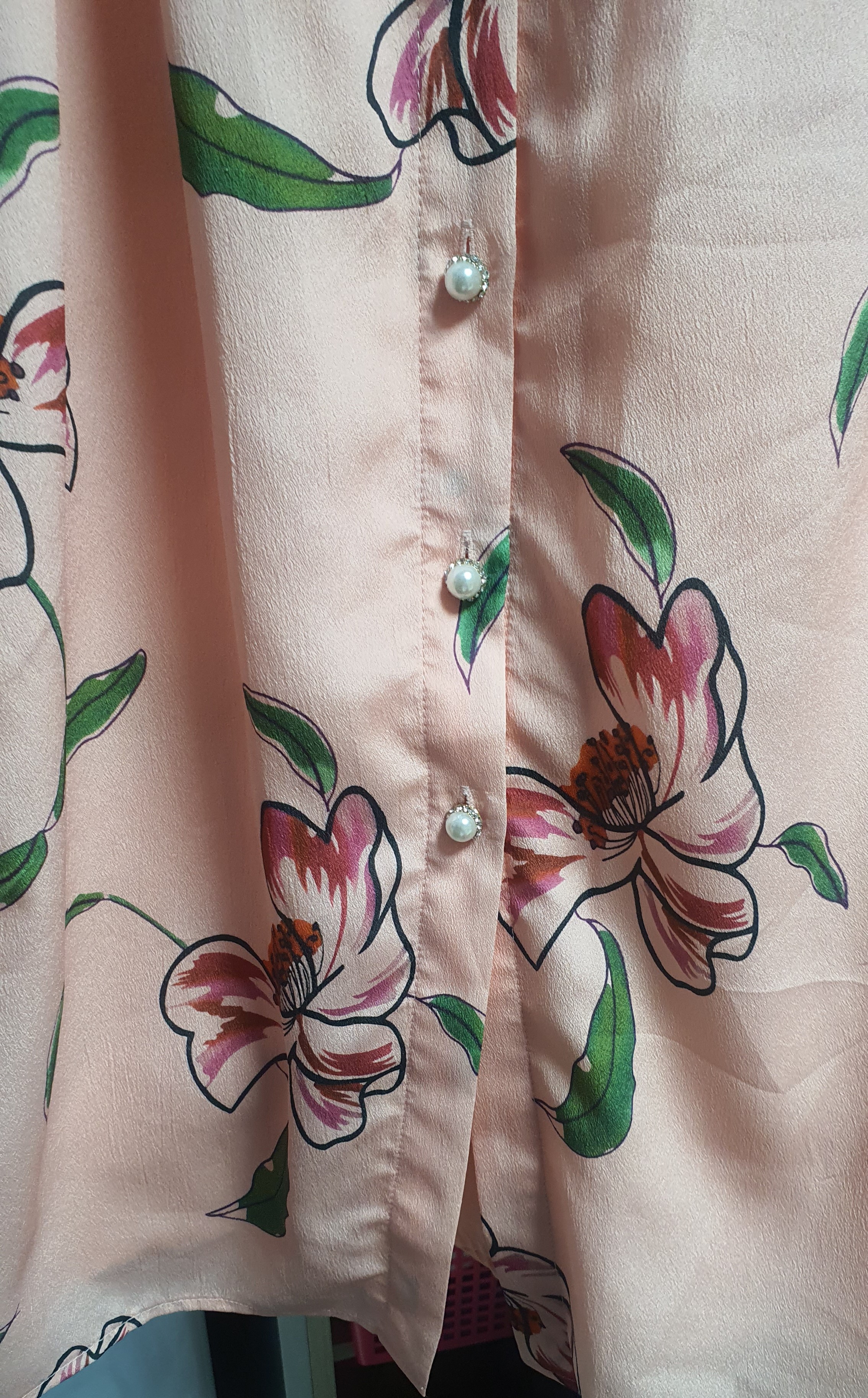 차르르 떨어지는 소재로 구김 없이 시원하게 입을 수 있는 샤틴원피스입니다. 은은한 딸기우유 같은 핑크색과 진한핑크로 물든 빅플라워 패턴으로 조화롭게 어울리는 반면에 허리에 그린계열 벨트로 포인트를 주었습니다. 유니크하지만 트렌디하게 입을수있는 옷이라서 하체가 조금 튼튼하시거나 피크닉 갈 때 편하게 입지만 튀어보고 싶을 때 입으면 좋은 옷입니다.