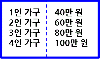 두 번째로는 가구별 지급인데요, 이번 5차 재난지원금 금액은 4차 재난지원금과 동일하게 진행이 될 텐데, 1인 가구는 40만 원, 2인 가구는 60만 원, 3인 가구는 80만 원, 4인 가구는 100만 원으로 예상이 되고 있습니다.