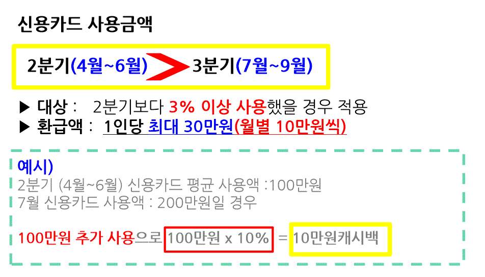 2분기인 4월~6월에 사용한 신용카드 금액보다 3분기인 7월~9월에 돈을 더 쓰면 돌려준다는 내용인데요, 아래에 간략하게 정리해드리겠습니다. 그외에 추가적으로 안내드려야 하는사항은 아래 보시고 캐시백 사용불가 업종을 참고하셔서 소비하시길 바랍니다.