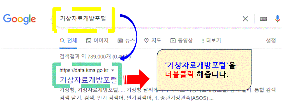 1. 구글에서 '기상자료개발포털'을 검색합니다. 또는 네이버에서 '기상자료개발포털'을 검색해주시면 됩니다. 본인이 잘 쓰시는 것으로 검색을 해주시면 됩니다.