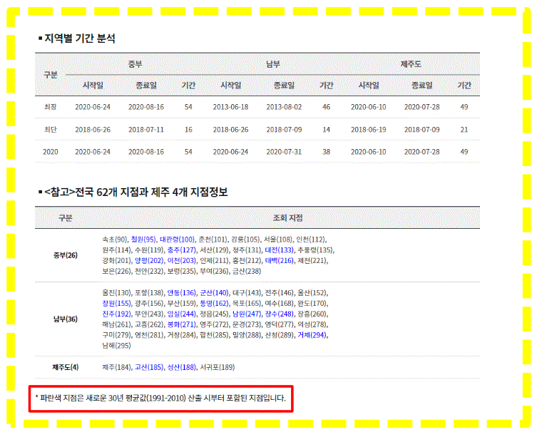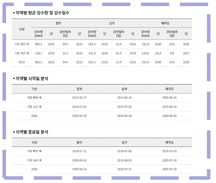 마지막으로 지역별 기간 분석이라고 해서 장마기간이 얼마나 길게 진행이 되었는지도 표로 한눈에 보이는데요, 2020년 중부지역은 무려 54일 동안이나 장마가 지속되었다고 합니다. 한 달 반이라는 엄청 긴 기간인데 2021년 올해는 장마기간이 어떻게 될지 정말 궁금합니다.