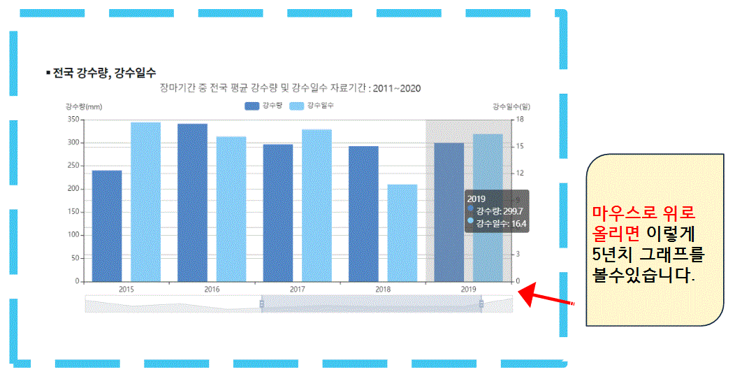 제가 마우스를 위로 쭉 올려보니 한 번에 5년 치 그래프를 볼 수 있습니다. 아주 사용하기 간편하게 되어 있어서 누구나 쉽게 2021년 장마기간을 알아볼 수 있겠습니다.