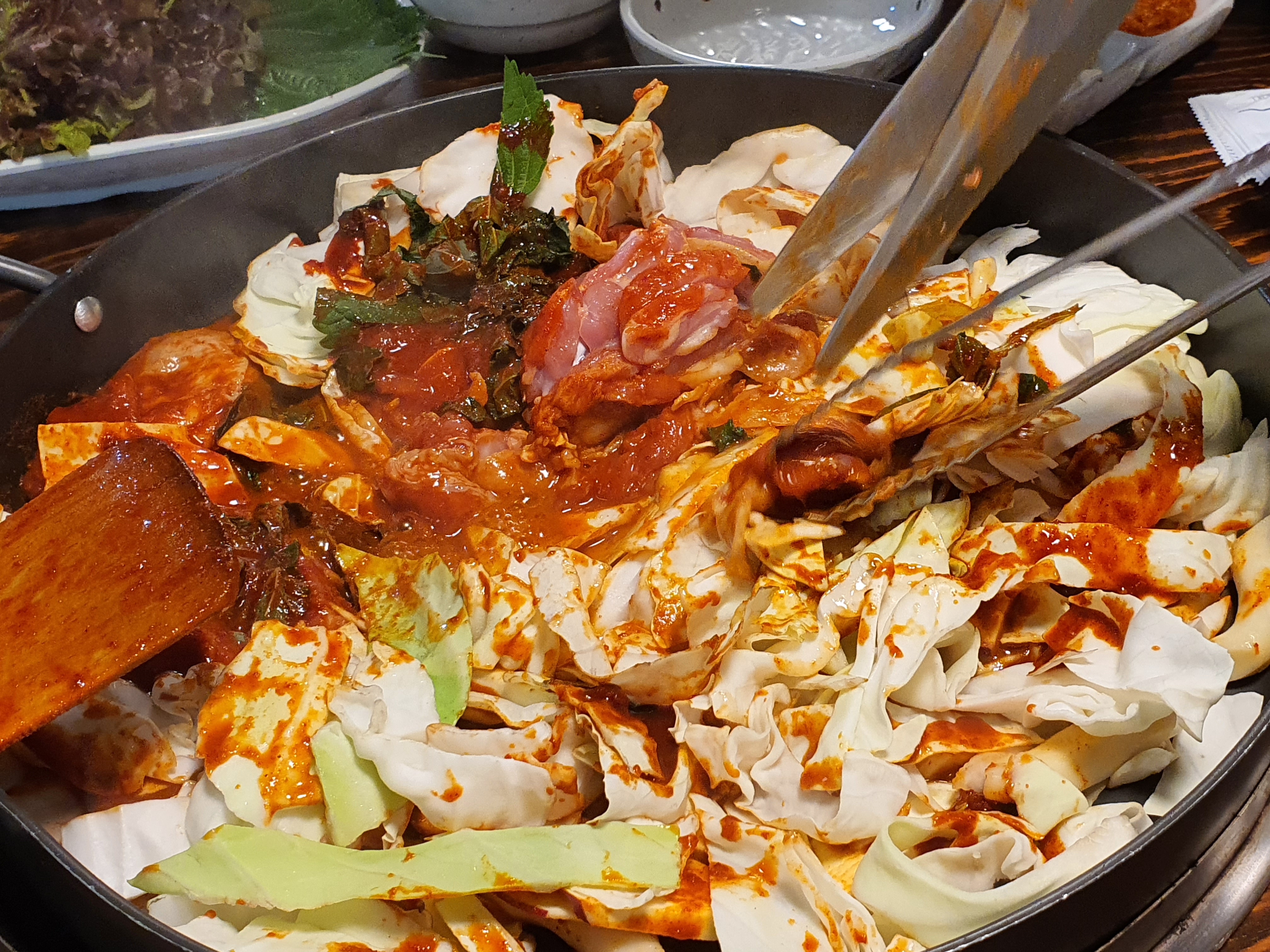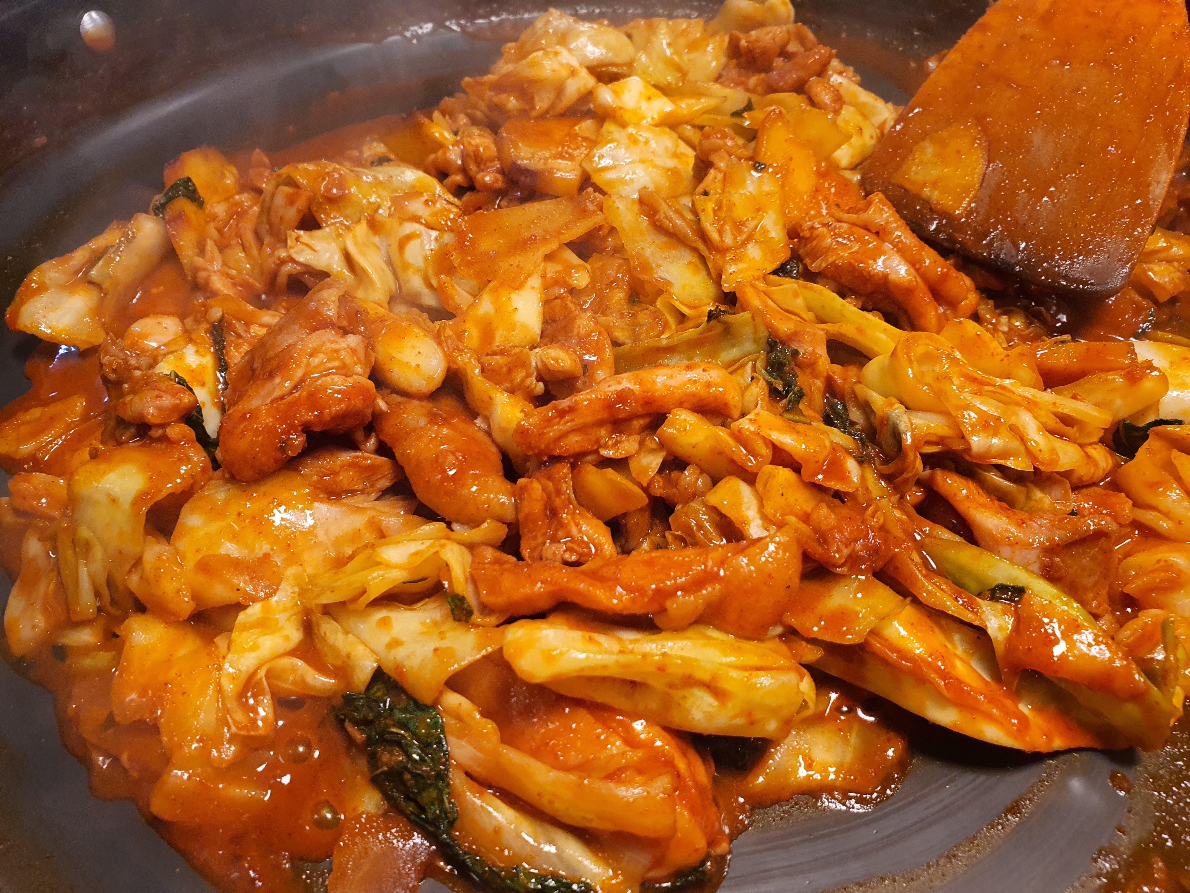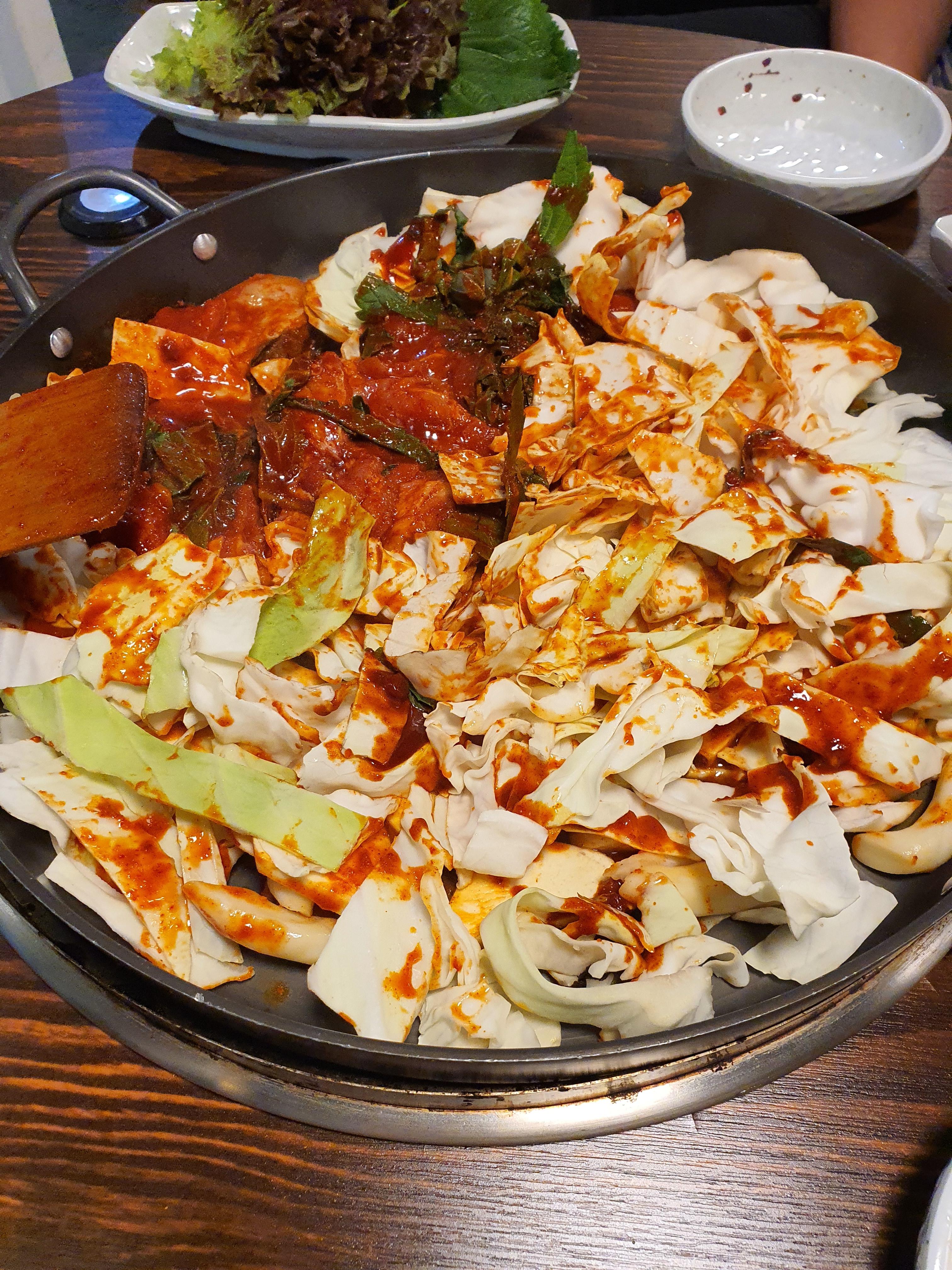 아주 잘 익은 닭갈비입니다. 정말이지 20년전통외대닭갈비 인증입니다!! 너무 맛있어요.. 한입 먹었는데 너무 맛있어서 말이 필요 없습니다. 안에 떡이랑 고구마 그리고 양배추가 골고루 들어있는데 사장님께서 재료를 아끼지 않고 마구마구 넣어주신 게 느껴집니다. 고기들이 신선해서 쫄깃하면서 식감이 좋고 한입부터 기분 좋아지는 맛이에요!!