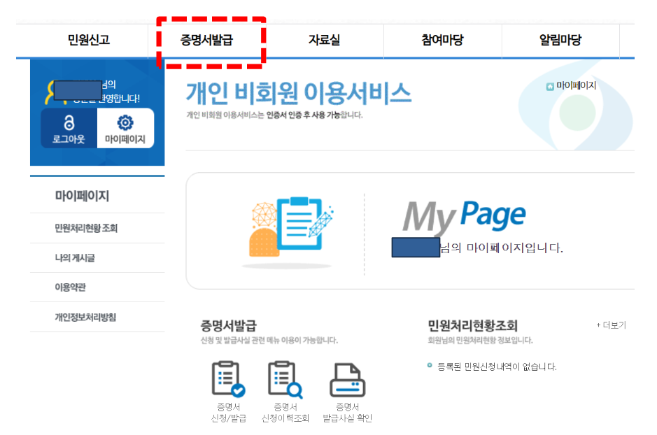 5. 로그인을 하셨을 경우, 000님 환영합니다라고! 뜨는데요, 위에 보시면 증명서 발급이라고 있는데, 그곳을 주목해주세요^^