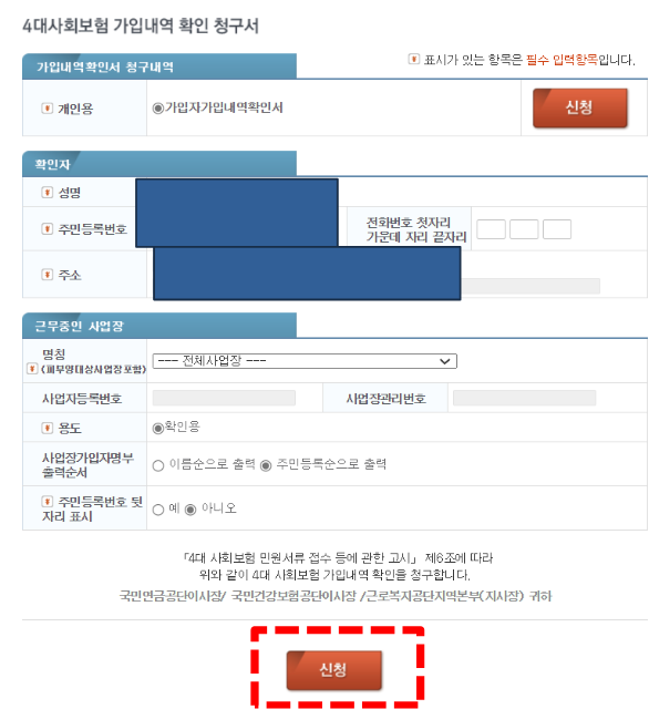 이제 본인의 신상과 동일한지 확인하시고, 바로 신청 버튼을 눌러주시면 됩니다.