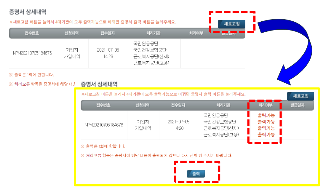 그러면, 이렇게 화면이 나오는데, 바로 새로고침을 눌러주시면 출력 가능으로 바뀝니다. 그 이후에 출력을 눌러주시면 됩니다. 절대로 f5가 아니라 위에 빨강 박스에 있는 새로고침을 눌러주셔야 합니다. 꼭 기억해주세요.