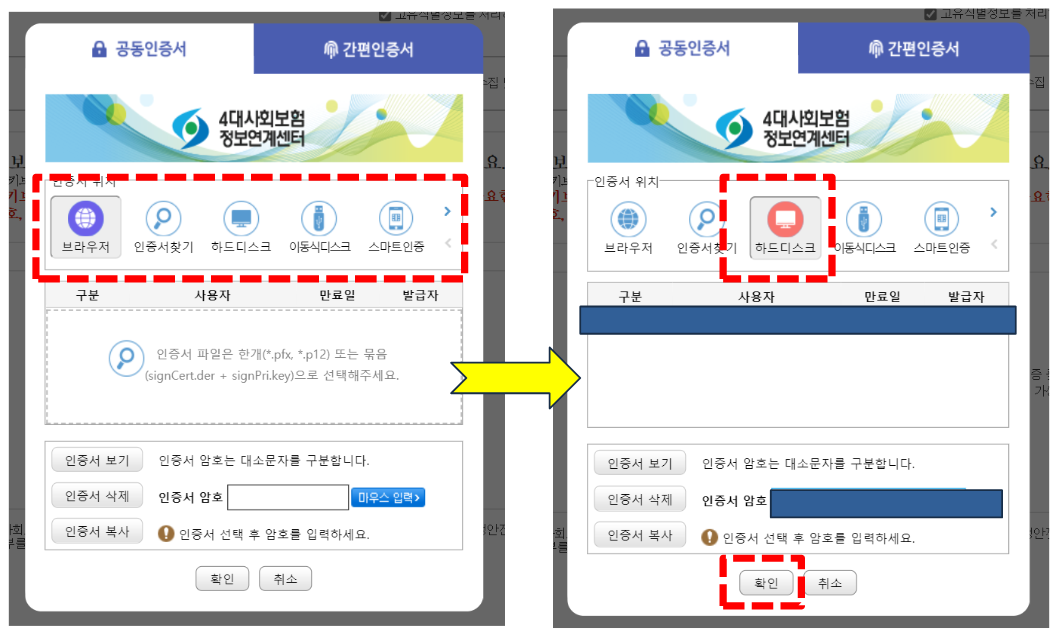 4. 컴퓨터에 공인인증서가 있으실 경우, 저처럼 하드디스크를 눌러주시고 아래에 공인인증서를 확인하고 암호를 입력하고 확인을 눌러주시면 됩니다. 혹시 없으실 경우에는 간편 인증서와 스마트인증으로도 가능하오니 참고 바랍니다.
