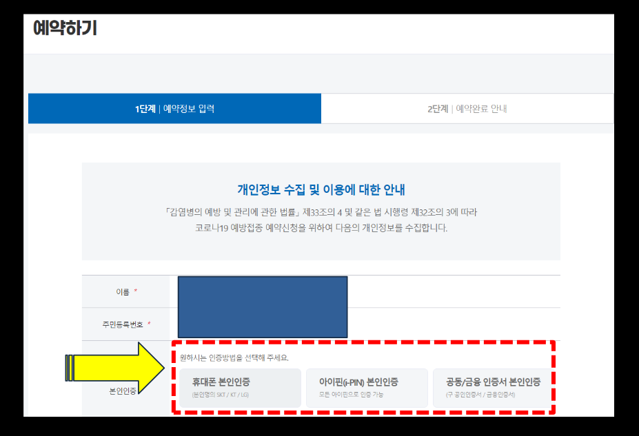 이제, 코로나 백신예약을 진행할 텐데요, 이름과 주민번호 그리고 본인인증을 필수도 하셔야 합니다. 저는 본인인증을 휴대폰으로 진행하였고요, 혹시 공인인증서가 있으시다면 공인인증서로 로그인하시면 됩니다. 본인인증 후 아래로 내려가면 추가적으로 진행해야 될 항목이 있는데요, 아래의 화면을 주목해주세요.