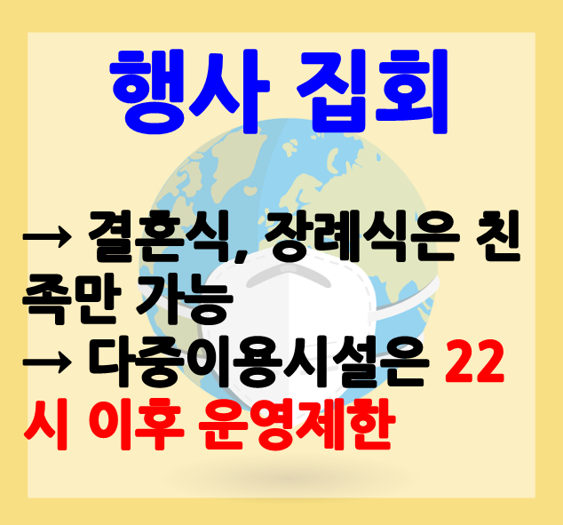 1인 시위 이외의 집회와 행사는 전면 금지가 되며, 결혼식과 장례식은 친족만 가능합니다. 단, 결혼식과 장례식은 친족만 49인까지 가능합니다.