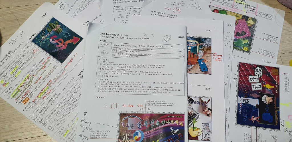 전부 출력을 해서 문제 1번부터 막막했었기 때문에 하나하나 적어가면서 어떻게 해야 되는지도 몰라서 순서와 모양 등을 적어서 풀었습니다. 저처럼 아예 포토샵을 모르시는 분들은 이렇게 하시는 게 정말 도움이 될 것입니다. 이렇게 1번부터 4번까지 시간이 오래 걸릴지라도 모의고사 3개까지는 이렇게 푸시면 점점 시간이 줄어들면서 방법을 터득하실 겁니다.