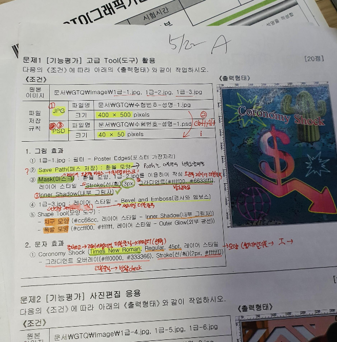 전부 출력을 해서 문제 1번부터 막막했었기 때문에 하나하나 적어가면서 어떻게 해야 되는지도 몰라서 순서와 모양 등을 적어서 풀었습니다. 저처럼 아예 포토샵을 모르시는 분들은 이렇게 하시는 게 정말 도움이 될 것입니다. 이렇게 1번부터 4번까지 시간이 오래 걸릴지라도 모의고사 3개까지는 이렇게 푸시면 점점 시간이 줄어들면서 방법을 터득하실 겁니다.