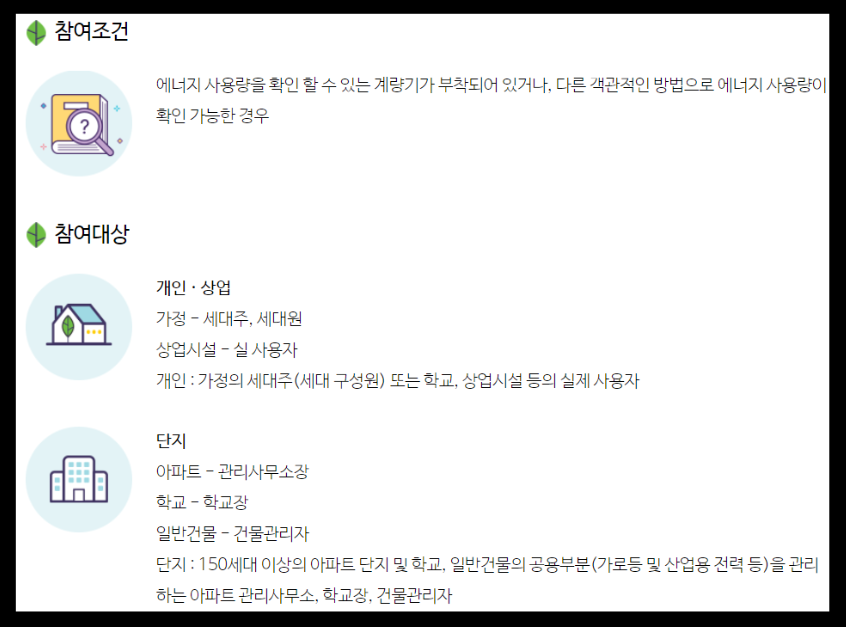 1. 참여조건 : 에너지 사용량을 확인할 수 있는 계량기가 부착되어 있거나, 다른 객관적인 방법으로 에너지 사용량이 확인 가능한 경우