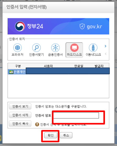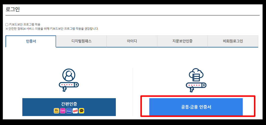 저는 공인인증서가 있었기에 공인인증서로 로그인을 진행했습니다.