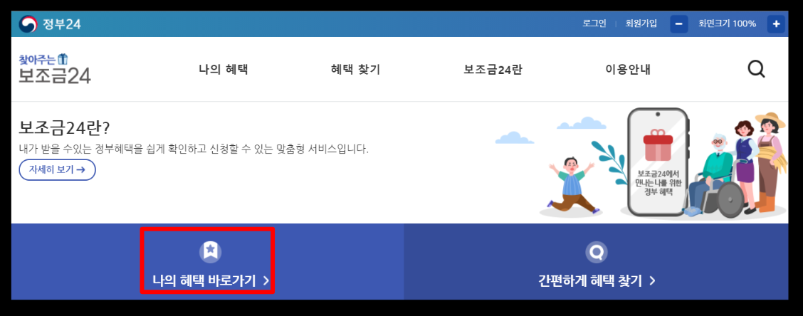 보조금24에서 나의 숨은 정부지원금을 찾아보려고 하는데요, 보조금24사이트에서 보면 나의 혜택 바로가기를 눌러줍니다.