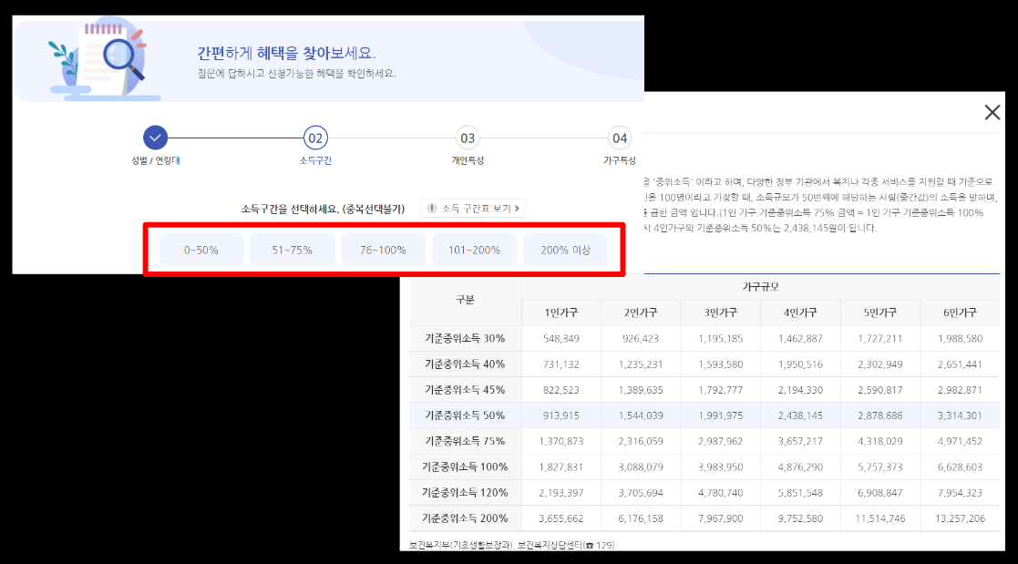 본인의 소득구간을 체크해야 하는데요, 소득구간 표를 눌러주시면 이렇게 표가 나옵니다. 표를 보시고 선택을 해주시면 됩니다.