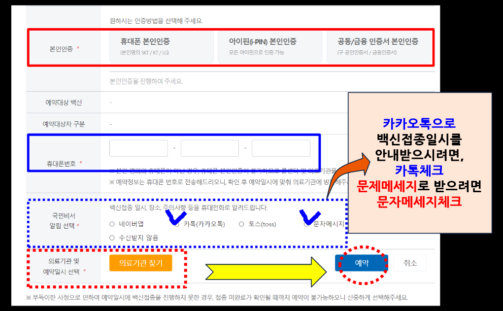 아래에 휴대폰번호를 잘 입력해주시고, 국민비서알림선택을 해주시면됩니다. 국민비서알림선택은 여러분이 백신접종일시, 장소, 주의사항, 예약번호를 받으실때 편한것으로 선택하시면 됩니다. 본인이 카카오톡 알람으로 백신안내를 받는게 가장편하실경우 카톡으로 체크해주시고, 카카오톡이 어려우시다면 문자메세지로 눌러주시면 백신접종예약후 안내가 문자로 발송될것입니다.