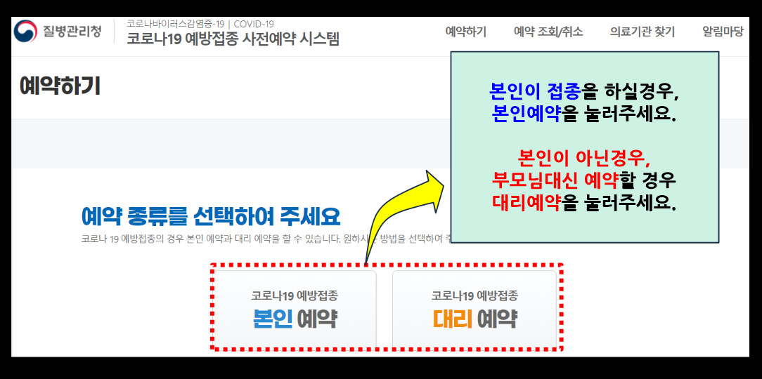 본인예약의 경우, 본인이 접종을 하실경우 눌러주시면됩니다.