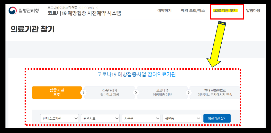 여기서, 의료기관찾기를 좀 헷갈려 하시는 분들이 계신데 어렵게 생각하지마시고 미리 의료기관을 알아두시면 작성하실때 편하실겁니다. 아래에 질병관리청 사전예약 시스템으로 백신 접종 예약할때 의료기관 찾기를 안내드릴테니 참고하셔서 백신예약을 하시길 바랍니다.