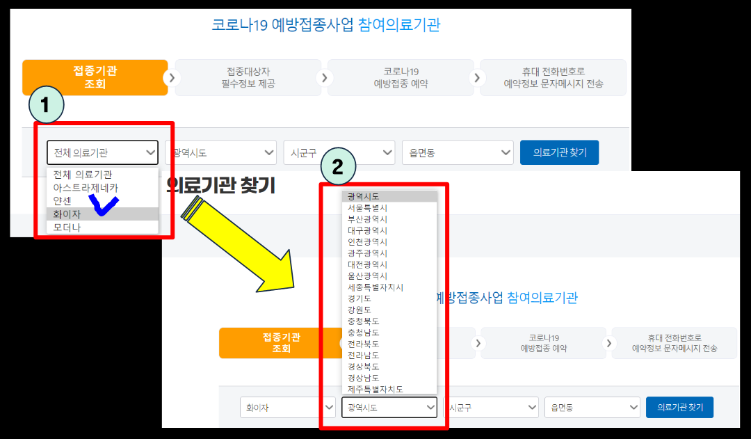 순서대로 따라하시면 됩니다. 저는 화이자를로 백신 접종 예약을 하고 싶기에 화이자로 선택했지만, 모더나, 얀센, 아스트라제네카로 예약하고 싶으신 분들은 맞고 싶으신 백신으로 선택해주시면 됩니다. 선택을 하셨다면, 백신 접종할 지역을 선택해야 하는데요, 본인의 집과 가장 가까운 곳으로 선택하시면 됩니다.